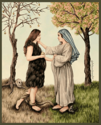 Our Lord’s eternal expiation should be completed by the obedience of a promised woman and virgin who, not unlike Eve in the fulness of grace and the state of innocence, vindicates the primordial mother of all the living by untying the knot of her disobedience while never having fallen from His grace (Lk 1:28). Eve received her name after her fall from grace. She was no longer called “Woman” once she lost her innocence and virginity. Jesus addressed his immaculate mother, Mary, as “Woman” in allusion to the enmity his heavenly Father had put between her and the serpent in the wake of Eve’s transgression.