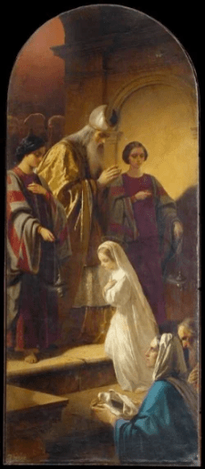 Referring to Mary’s question to the angel Gabriel after he announced that she would conceive and bear the Messiah in Luke 1:34, Augustine reasons that Mary must have already consecrated herself to God and vowed to remain a virgin all her life while serving in the temple as a young girl. There is testimony of temple virgins in the traditions of the Jews. In the Mishnah, it is recorded that there were 82 consecrated virgins who wove the veil of the Temple: “The veil of the Temple was a palm-length in width. It was woven with seventy-two smooth stitches each made of twenty-four threads. The length was of forty cubits and the width of twenty cubits. Eighty-two virgins wove it. Two veils were made each year and three hundred priests were needed to carry it to the pool” (Mishna Shekalim 8, 5-6). Rabbinic Jewish sources also record how when the Romans sacked Jerusalem in AD 70, the Temple virgins leapt into the flames so as not to be abducted by the heathen soldiers: “The virgins who were weaving threw themselves in the flames” (Pesikta Rabbati 26, 6). This supports the claims of the Fathers and Doctors of the Church, who assert that the Blessed Virgin Mary was presented to the Temple at the age of three and served there until the age of twelve.
