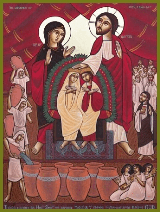 Jesus is journeying to Cana in Galilee, while John continues to baptize people in the Jordan, many of whom will follow Jesus and have the light of life through the regenerating baptismal water: men and women of every kind, the great and the small alike. Up to three thousand people were baptized on the first Pentecost Sunday (Acts 2:41). The second creation story begins in Chapter 2 of John’s Gospel with the marriage feast in Cana attended by the New Adam (Jesus) and his helpmate the New Eve (Mary) present there with him.