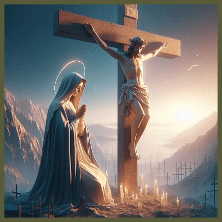 The Cross remains ever-present before her, a symbol of her enduring commitment to humanity’s salvation. In his final moments, Jesus affirms and ratifies Mary’s maternal saving office when he entrusts her to the beloved Disciple, saying, “Woman, behold your son,” and to the Disciple, “Behold your mother.” This poignant moment highlights not only Mary’s role as the Mother of Jesus but also extends her motherhood to all believers, inviting them into a profound relationship with her as their spiritual mother. Through her intercession, she continues to guide and strengthen the faithful, nurturing their journey toward eternal life.