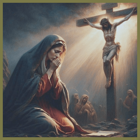 The scene at the Cross is rich with imagery from the Old Testament, particularly themes related to prophecy and Jewish traditions. Key passages from Isaiah—specifically 49:21, 54:1-3, and 66:7-11—highlight the sorrow of Mother Zion as she mourns the loss of her children. However, this sorrow is juxtaposed with the promise of a new and larger family, restored through God’s grace, which leads to joyful celebration, as indicated in Luke 1:46-55 and Zephaniah 3:14-17.